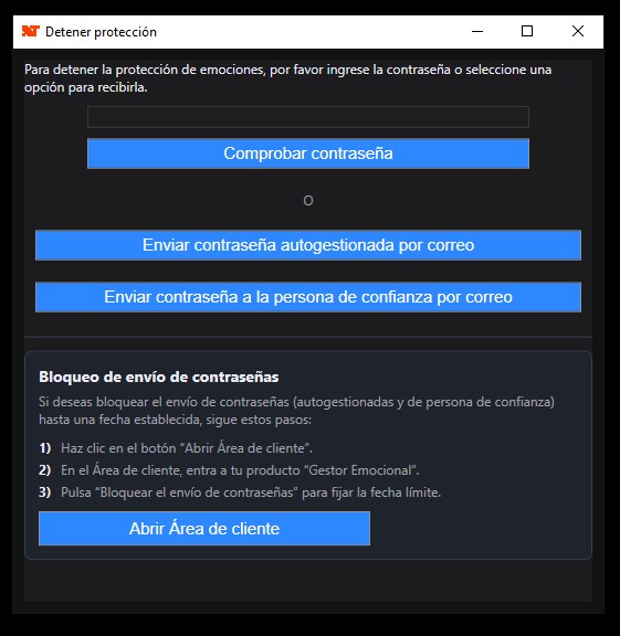This will make the emotional manager NOT be able to be unlocked NOR using the passwords previously explained. This functionality deactivates the sending of both passwords (both the self-managed and the trusted person’s) until a future date that you will choose. Because it is a fairly strong restriction, the maximum time for the password sending lock is 30 days. After those 30 days, you can activate the password lock again for 30 more days indefinitely if you wish.