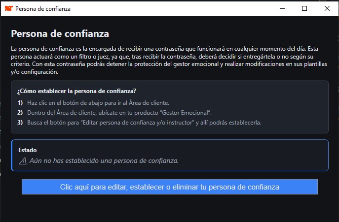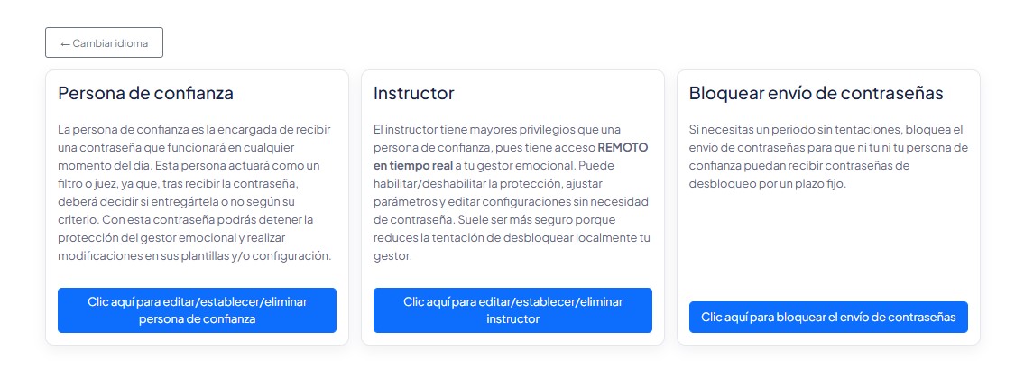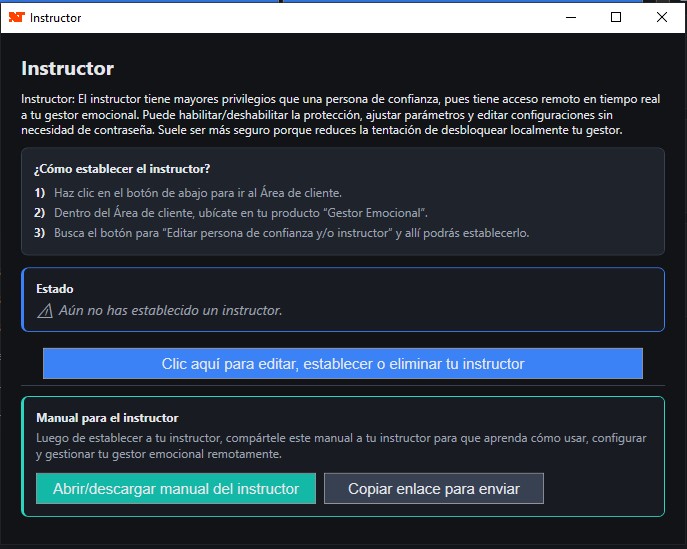 The usefulness of the instructor is to keep the “lock” of the emotional manager out of the user’s reach: If the user needs to modify something, then they request it from the instructor to do it remotely. In this way, it prevents the user from being able to unlock their emotional manager and never lock it again.