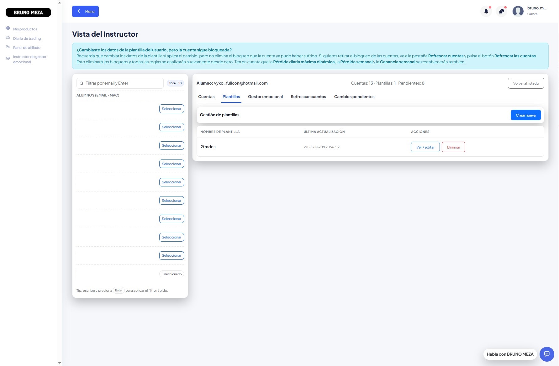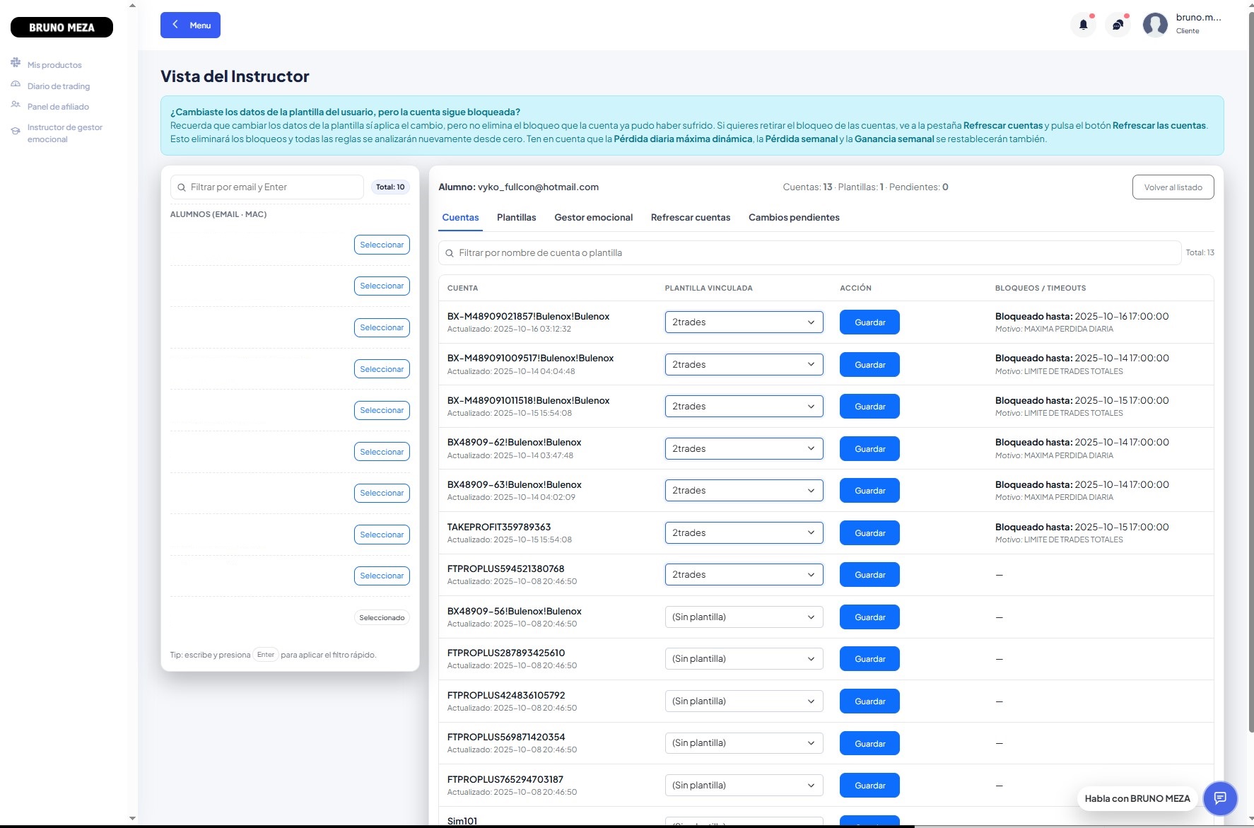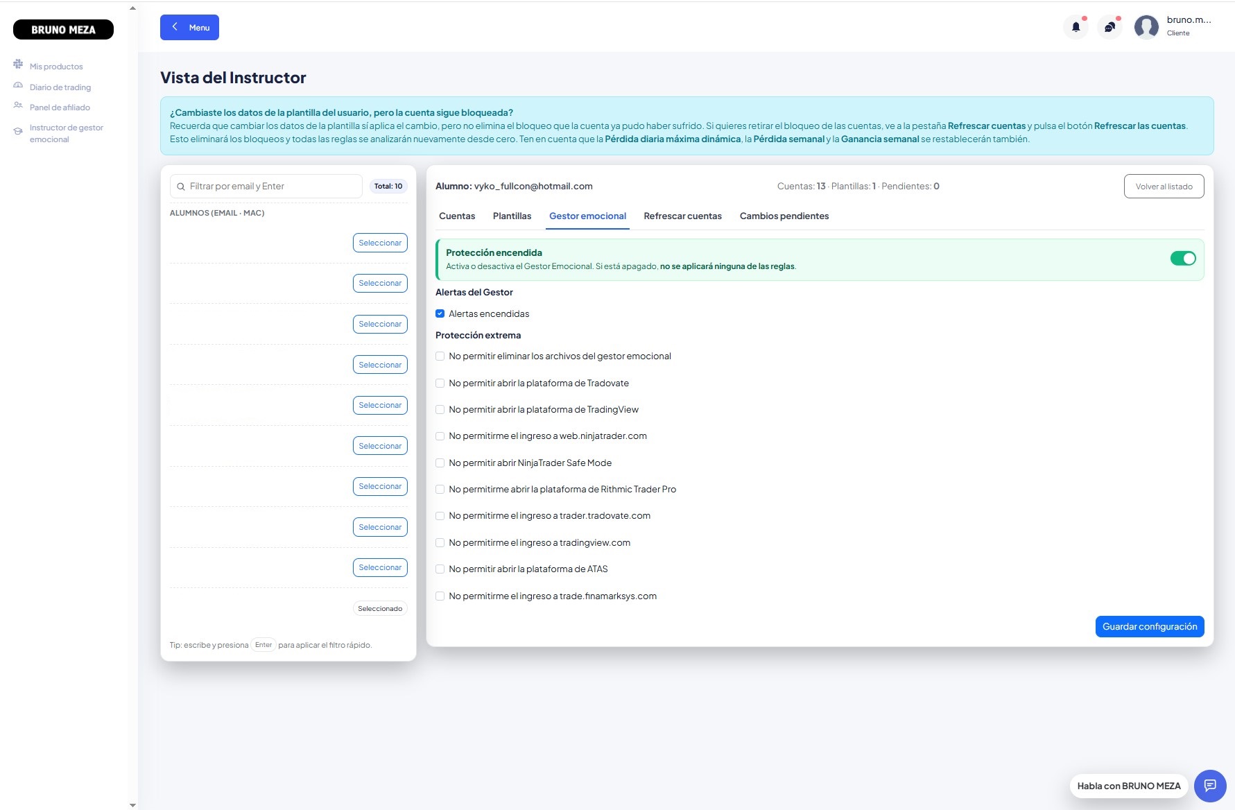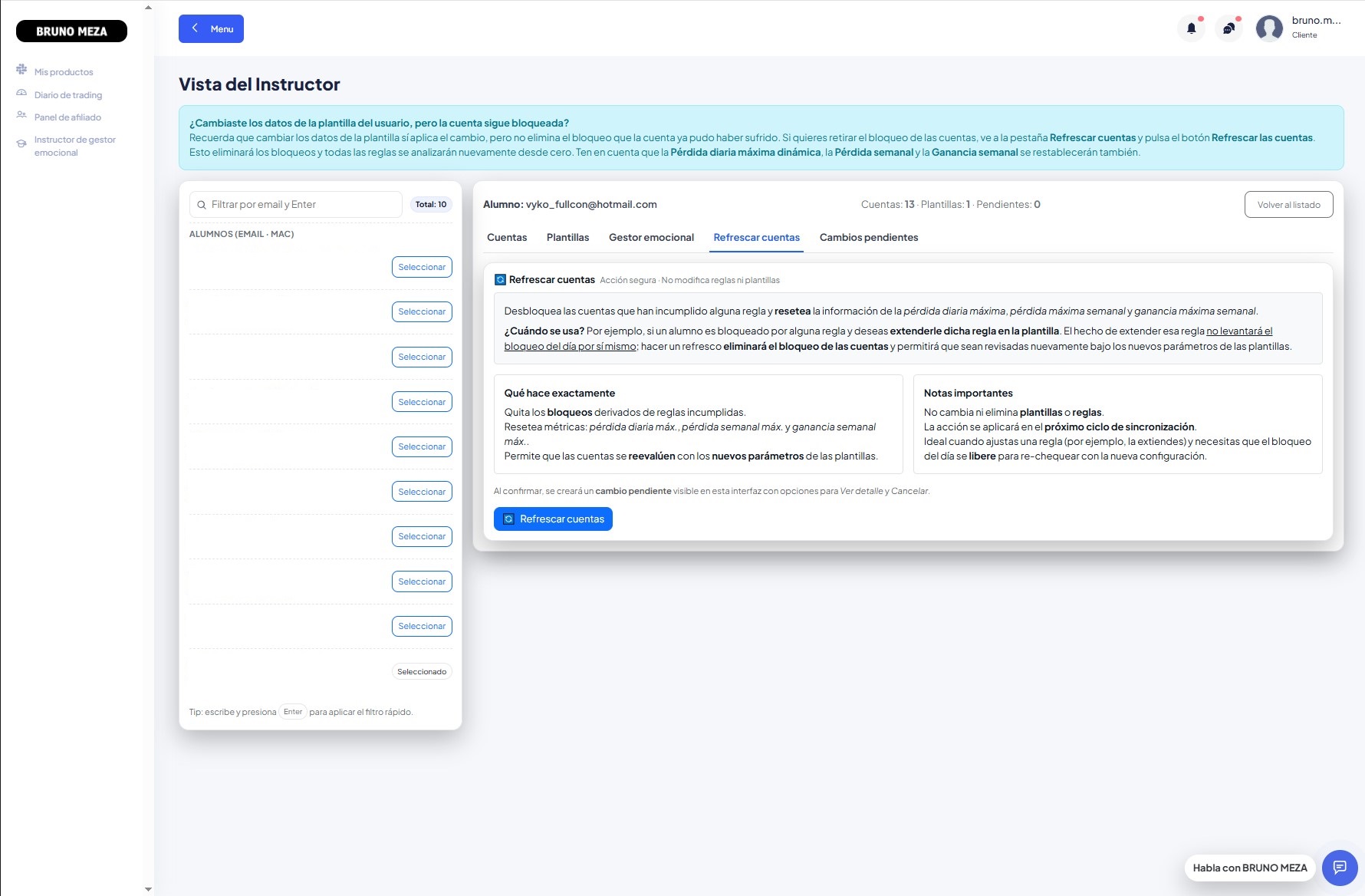 Remember that BRUNO MEZA’s emotional manager will reset the rules of the accounts and will unlock them automatically at each start of the trading day (6 PM New York time).