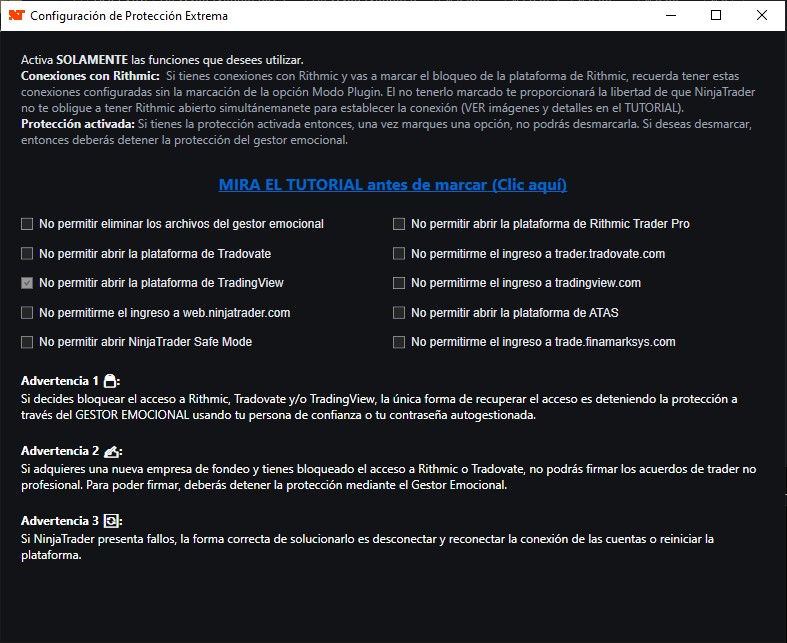 The Emotional Manager for NinjaTrader 8 is your perfect ally to follow your trading plan and avoid unnecessary losses. This tool blocks the possibility of trading in NinjaTrader 8 when you break any rule established in your trading plan.