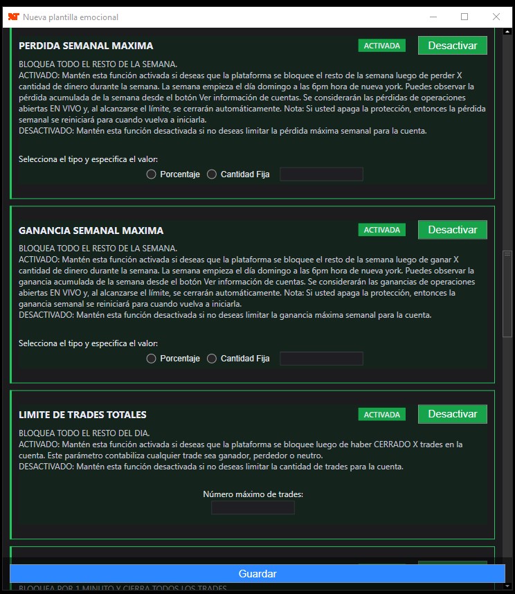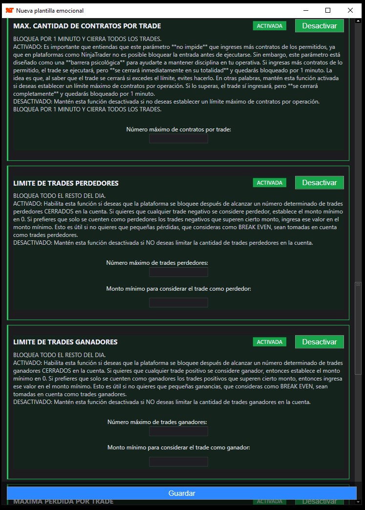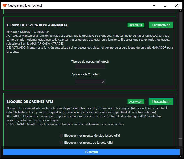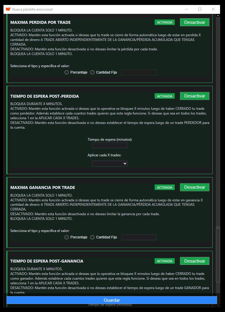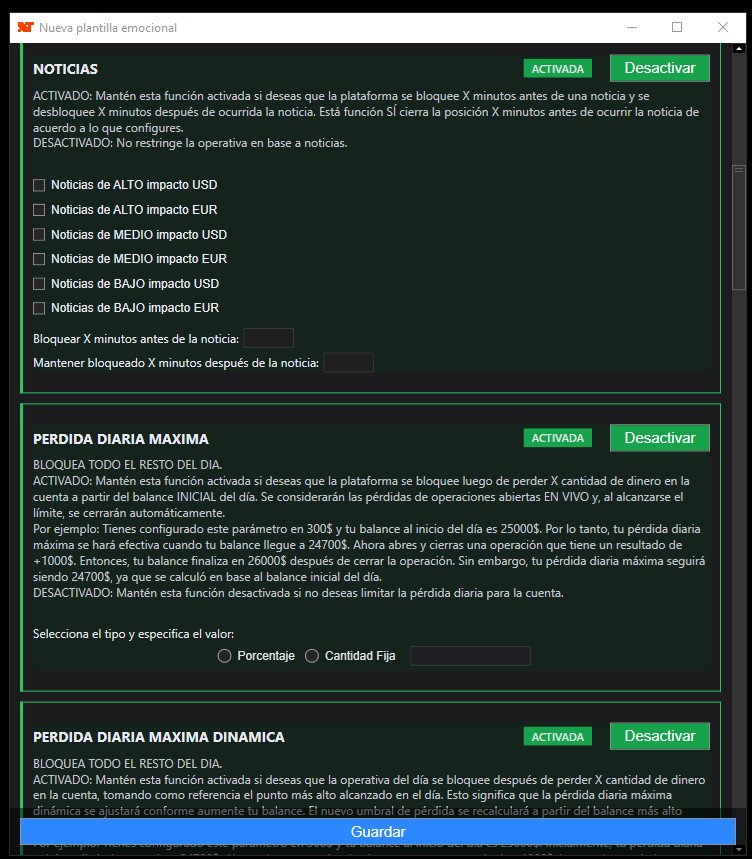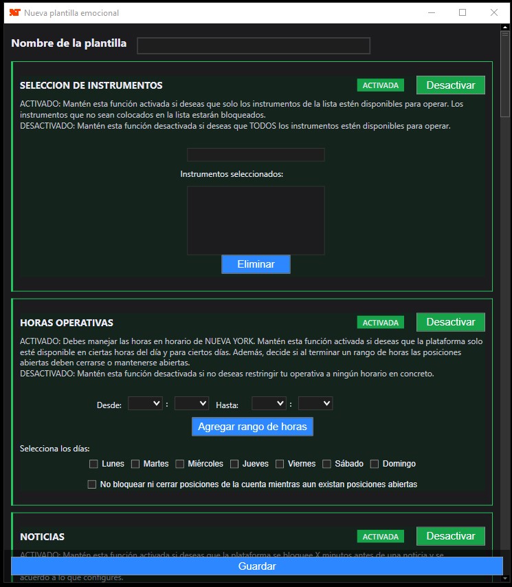 Other emotional management tools allow you to change the configuration of the established rules while they have not yet been violated. This makes these management tools not useful, since the operator, when close to breaking their rules, can change their parameters or even turn off their management tool to continue trading.This will NOT happen with BRUNO MEZA’s emotional manager! since the templates and their configuration are NOT modifiable during operating hours and, even, they may not be modifiable outside operating hours at the user’s choice (more information about this if you keep reading).