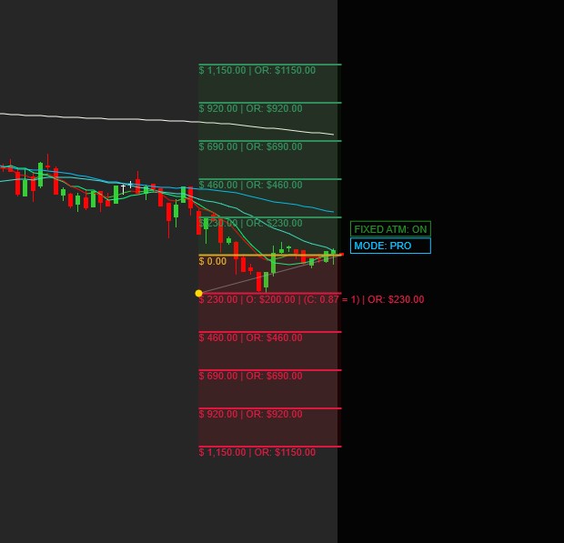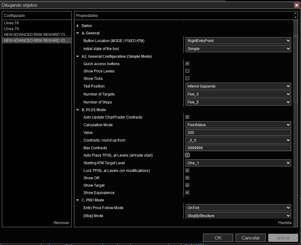 Modo PLUS: Además de lo incluído en el modo simple, cuando usas el modo plus la herramienta calcula la cantidad de contratos necesarios para arriesgar un monto definido de dinero. Además, sincroniza tu estrategia ATM ajustando las órdenes de targets y stops a los niveles de la herramienta. Si lo deseas, también los ajusta automáticamente cuando mueves la herramienta de dibujo sobre el gráfico durante una operación.