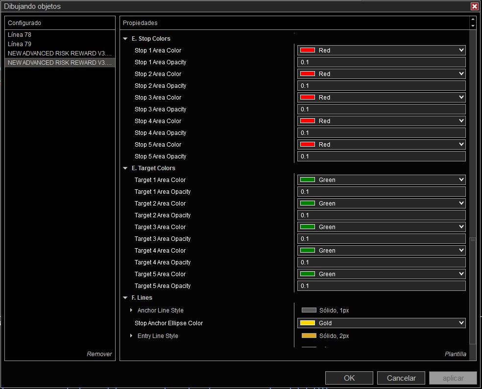 Configura cuántos niveles de target y cuántos niveles de stop quieres visualizar en la herramienta. La herramienta te permitirá tener hasta 5 niveles de target y 5 niveles de stop loss. Cada uno en ratio distinto a elección del usuario.